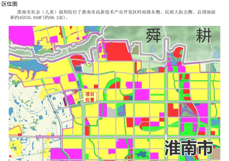 项目地块位于淮南市高新技术产业开发区岭南路东侧、民裕大街北侧,土地性质为其它公共设施用地。