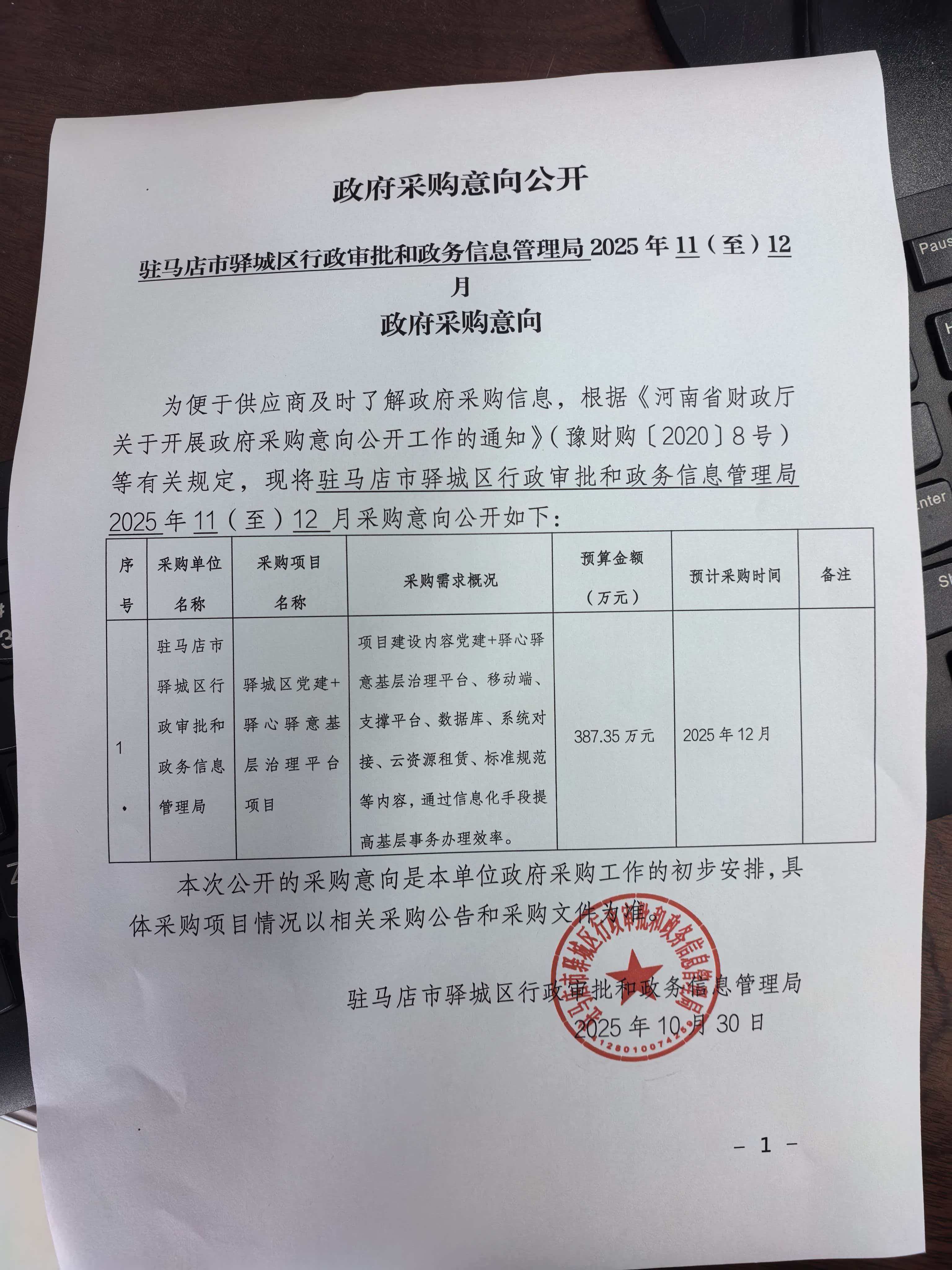 为便于供应商及时了解政府采购信息,根据《河南省财政厅关于开展政府采******管理局 2025年11(至)12月采购意向公开如下:
